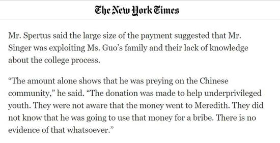 比如在《纽约时报》的报道中,郭家的律师就表示郭家并不了解美国大学申请的流程手续,而且以为这笔钱只是给学校的捐款,而辛格便利用了他们的无知,骗他们一下子拿出了上百万美元。