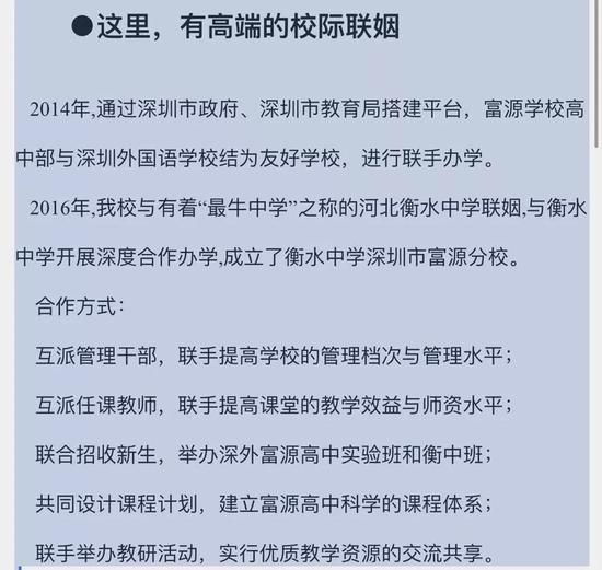 2016年11月,衡水中学深圳市富源分校揭牌成立。据2017年富源学校官网高中部招生宣传,该校与衡水中学的合作办学内容中包括联合招收新生,开办衡水班。