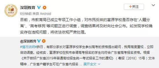 29日,深圳市教育局在其官方微博发布说明称,富源学校学生(包括户籍在广东省内深圳市外的)均提供了户籍所在地公安部门及深圳市学籍管理部门对其户籍、学籍的审核证明,手续齐全、资料完整,符合在深圳参加高考的报名条件。