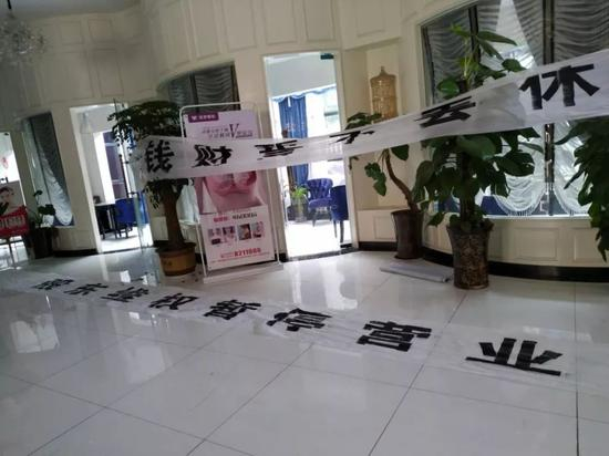 4月24日,在深一度记者探访时,已经停业的垣梦美容机构门前有两名保安看守。大厅留有股东维权的白底黑字横幅,上面写着“不退钱财誓不罢休”。