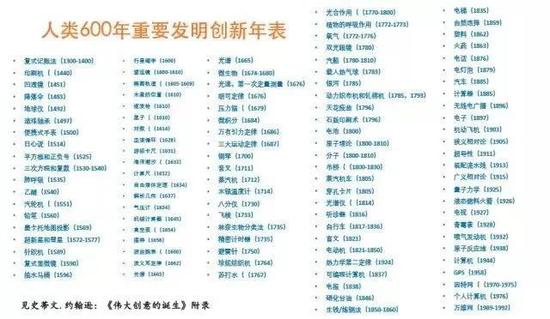 图上都是发明创造的故事,这是我从一本书的附录里看到的人类六百年来的重大发明,你随便扫一眼,想一想如果这些东西都没有,现在的人类会怎样?