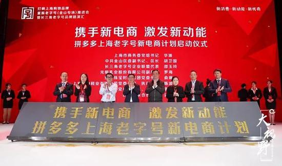| 上海市商务委党组书记华源(右四),中共金山区委副书记、区长胡卫国(左四),长三角老字号企业联盟代表邵玉玲(右三),拼多多联合创始人达达(左三),以及上海老字号代表品牌相关负责人,联合启动“上海老字号新电商计划”。