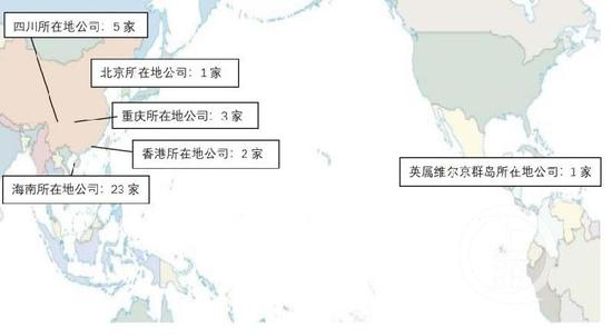 上游新闻记者查询发现,海南明日香旅业有限公司、海南华君农业科技有限公司、海南华君惠民商贸有限公司、海南东坡国际旅游文化投资有限公司、海南华君商贸有限公司、海南华君医院投资服务有限公司、海口天赐物业管理有限公司、海南唯舍房地产有限公司等8家公司,注册地址均为刘远生开发建设的海口市丘海大道56号水云天小区。