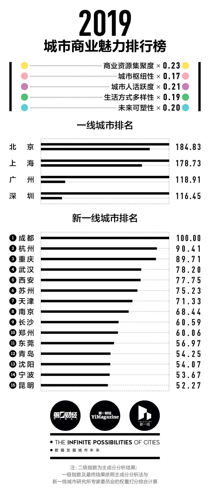 说明:商业魅力指数满分不为100,最高分为一线城市的最高值,即北京的184.83分。为便于读者理解,新一线城市最高分呈现为100分。