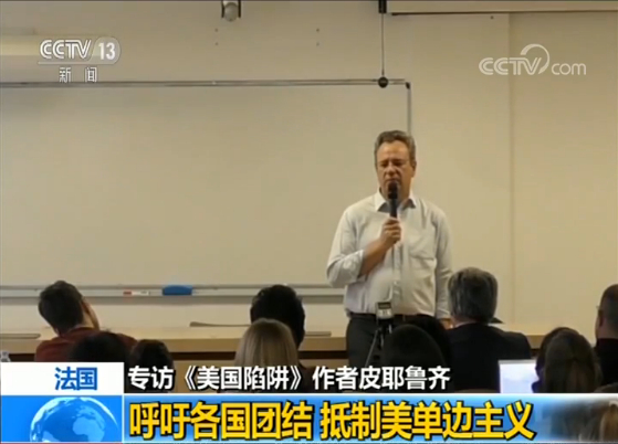 30日,央视记者在巴黎采访了皮耶鲁齐。皮耶鲁齐说,“美国陷阱”就是美国利用其法律作为经济战的武器,来削弱竞争对手的一种不正当手段!而他写本书的目的之一,就是警示他国企业和领导层防范于未然。