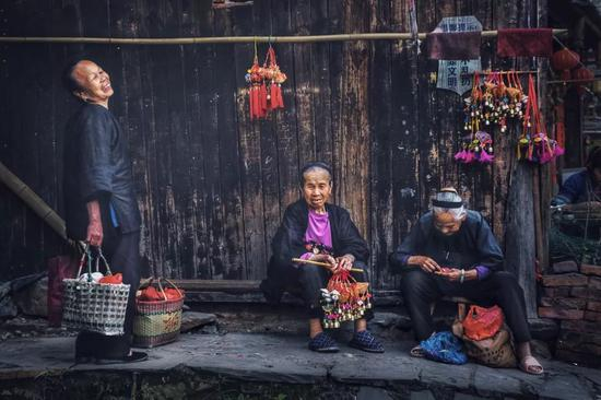 (拍摄于广西三江程阳寨,当地旅游业的发展,让做手工艺品的老人也得到实惠,摄影师@卢文)