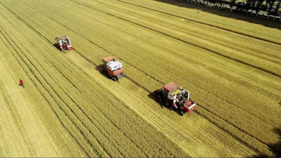 (河南济源市梨林镇大许村组织收割机夏收场面,摄影师@邓国晖)