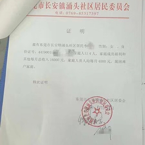 这份盖有广东省东莞市长安镇涌头社区居民委员会的红色公章、落款时间为2019年5月25日的证明文件称,东莞市长安镇涌头社区李姓居民家庭成员福利和其他每月总收入16000元,家庭人员人均每月4000元,属困难户家庭。特此证明。