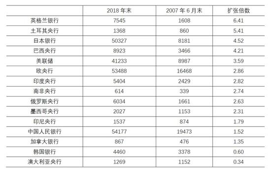 比较而言,人民银行资产负债表温和扩张,从2007年6月末到2018年末扩张了1.52倍,在G20国家15个中央银行中排名第12位,在金砖国家中排名最低。2018年末,人民银行资产规模为5.42万亿美元,高于欧央行(5.3万亿美元)、日本银行(5万亿美元)和美联储(4.1万亿美元)。