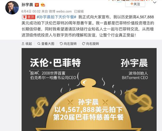 但是,自从拍下巴菲特午宴之后,孙宇晨的微博成了群众吃瓜的好去处。