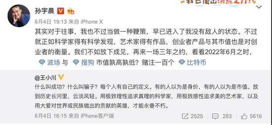 说起往事,有网友翻出孙宇晨2月份发布的一条朋友圈。孙宇晨谈到:“2014年11月24日,自己和王小川录制节目。我永远也忘不了他这打量骗子的眼神,他说我是骗子,肯定会失败,和我录节目是耻辱,最后甚至没法录下去。后来不到三年我公司就超过搜狗市值。人生中,瞧不起你的人对你的鞭策更加刻骨铭心。”