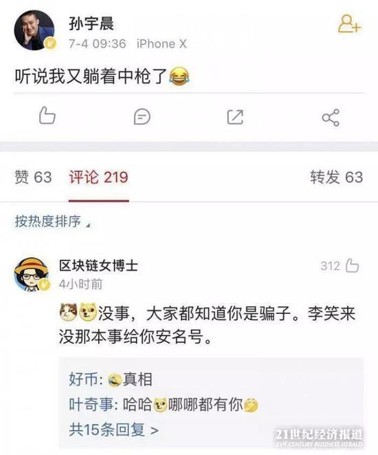 当时,孙宇晨微博称“听说我又躺着中枪了”。而热门评论中网友“区块链女博士”回复:“没事,大家都知道你是骗子。李笑来没那本事给你安名号。”得到许多网友点赞。
