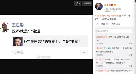 随后的一张截图显示,王思聪在朋友圈转发《孙宇晨巴菲特的餐桌上,全是“韭菜”》一文时,配上”这不就是个傻X“几个字。