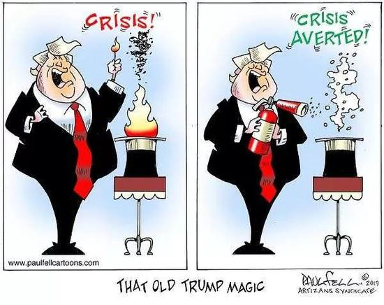 ▲【“特朗普式”魔术】左图:“魔术师”特朗普总统用火柴把礼帽点燃,声称:“发生危机了!”右图:特朗普用灭火器灭火后宣称:“危机解除!”图下方的英文意为“特朗普的那种古老魔术”。(美国报刊漫画家协会网站)