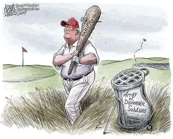 ▲【“大棒”总统】“高尔夫球手”特朗普总统的“外交解决手段”球袋空空如也,他手中就拿着一根“关税”大棒,四处乱挥。(美国报刊漫画家协会网站)