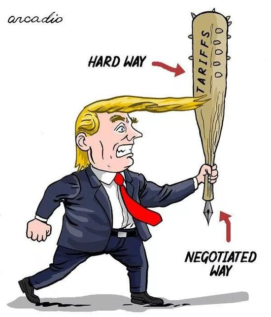 ▲【两种方式】美国总统特朗普手持的大棒象征着他对待世界的两种方式:有狼牙的“关税”大棒是“强硬的方式”,大棒末端的笔尖是“谈判的方式”。(美国卡格尔漫画网)