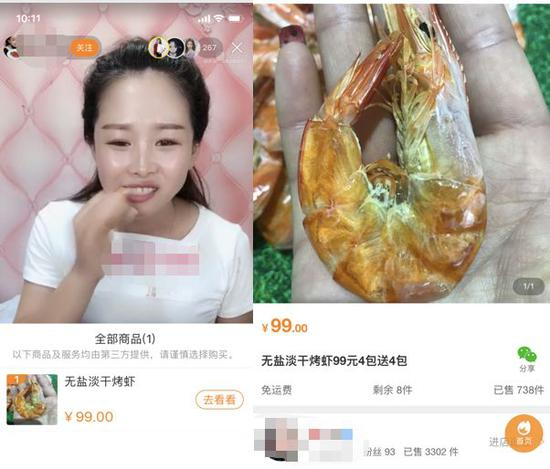 在带货方面,播主们几乎每天都定时在快手上直播吃饭,顺便卖货,其中不乏一些“三无产品”。以一个海鲜吃播主为例,她昨晚以直播方式卖烤虾,但烤虾的购物页面没有写烤虾的商品详情,也没有标注品牌和重量,只是写着“无盐淡干烤虾99元4包送4包”,但页面显示已售738件。