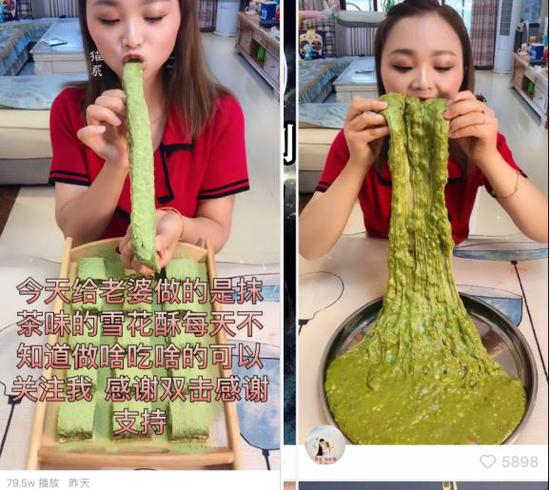 比如这个教做抹茶雪花酥的视频,本来看起来很美味可口,但却要用吃着一盘绿色黏稠状不明物体的画面做封面图,点击量达到了近80万,如果封面是如何制作雪花酥,确实也很难有现在的效果。