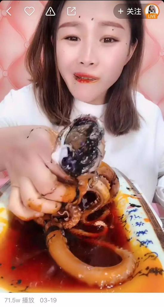 “肚包脑包章鱼”也是最近流行的吃法,播主一口咬开肚皮露出白花花的脑子,看完这个画面实在没有吃午餐的欲望了。