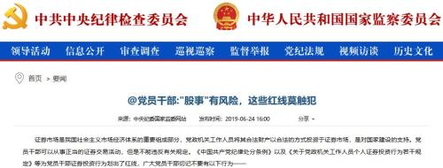 中央纪委国家监委网站6月24日发文表示,证券市场是我国社会主义市场经济体系的重要组成部分,党政机关工作人员将其合法财产以合法的方式投资于证券市场,是对国家建设的支持。党员干部可以从事正当的证券交易活动,但是不能违反有关规定。