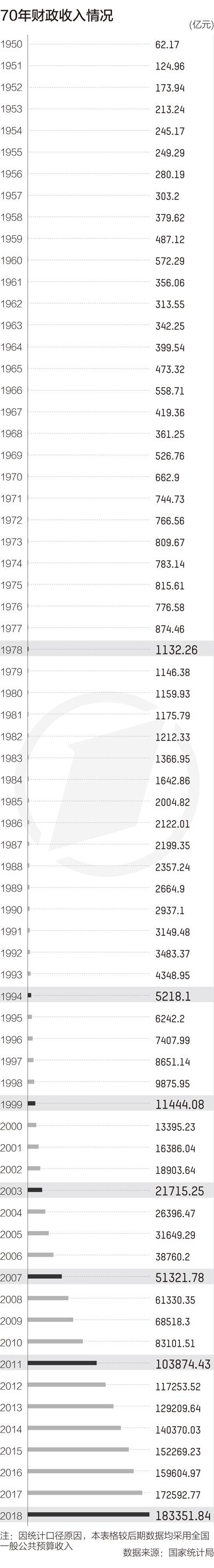 1950年我国财政收入约62亿元,2018年这一数字(窄口径,仅指全国一般公共预算收入)跃升至183352亿元,后者是前者的约2956倍。如果加上2018年政府性基金收入75404亿元,那么2018年财政收入达258756亿元,是1950年财政收入的4173倍。