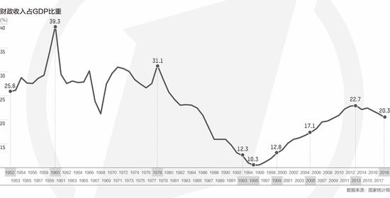 新中国成立之初,百废待兴,财力分散薄弱,在计划经济时期建立了“统收统支”的财政体制。这反映在财政收入占GDP比重维持在较高水平,1960年达到39.3%最高点。
