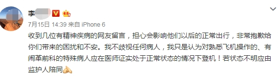 编剧李某15日下午发文称,她收到几位有精神疾病的网友留言,担心会影响他们以后的正常出行。李某表示:“非常抱歉给你们带来的困扰和不安。我不歧视任何病人,我只是认为对熟悉飞机操作的、有过前科的特殊病人应在医师证实处于正常状态的情况下登机,若状态不明应由监护人陪同。”