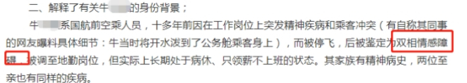 持续发酵十二小时之后, 事件出现了戏剧性的转折。也就是在13日当晚,国航相关负责人曾向编剧李某以及被此事影响的公务舱旅客致歉,并解释了牛某某的身份背景,称其确实是国航员工,但因十几年前精神出现问题,已被停飞多年,患有双相情感障碍。