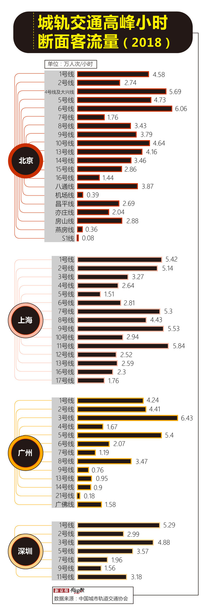 中国城市轨道交通协会发布的《2018 年中国城市轨道交通年度统计分析报告》显示,北上广深四座城市的城市轨道交通中,高峰小时断面客流量最高的分别是北京地铁 6 号线( 6.06 万人次/小时 )、上海地铁 11 号线( 5.84 万人次/小时 )、广州地铁 3 号线( 6.43 万人次/小时 )和深圳地铁 1号线( 5.29 万人次/小时 )。