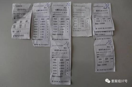 王波的“彩票”与打印在热敏纸上的正规彩票不同,这是白纸黑字的,就像餐馆就餐打印出来的结账单一样,上面有号码、赔率以及下注金额。