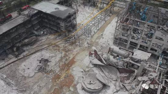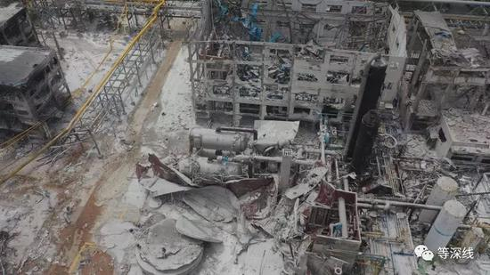 本次爆炸损毁最严重的区域西北侧的4层厂房,1楼以上的墙体、楼板、屋顶全部消失。只剩四侧部分钢筋混凝土框架。如果从东偏南方向远远望去,该处残存框架的墙体如电影灾难片搭建的背景一样,向后整体不规则倾斜着,高高矗立,很有视觉效果。