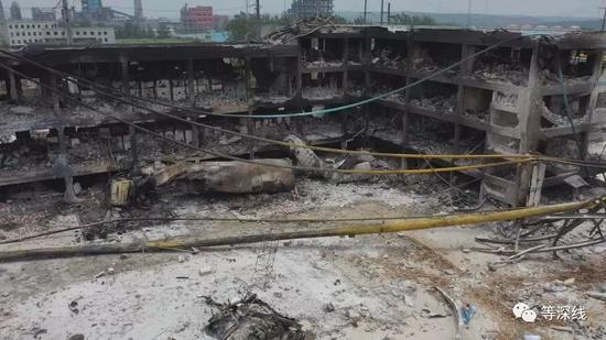 距离本次爆炸损毁最严重的区域东南侧52米的一栋丁字形4层楼建筑,在本次爆炸中受损严重,这栋总长78米的建筑,靠爆炸损毁最严重的区域一侧的墙体基本全部消失,另一侧的前提也基本荡然无存,不仅如此,该楼体还被爆炸时产生的燃烧,把整栋楼烧得漆黑,遍地的白色消防残留物,都遮不住黑色的楼体。