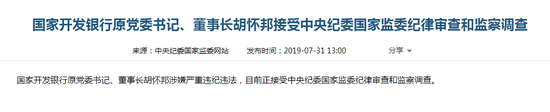 7月31日,环环从中央纪委国家监委网站得知消息,国家开发银行(下称“国开行”)原党委书记、董事长胡怀邦涉嫌严重违纪违法,目前正接受中央纪委国家监委纪律审查和监察调查。