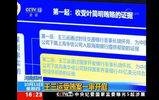 当晚,央视披露了庭审画面,以及检方提供的证据。画面显示,王三运收受的贿赂中至少有两次与胡怀邦有关。