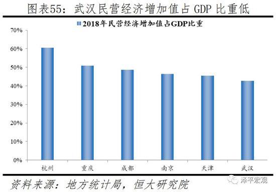 武汉民营经济增加值比重仅43%,在十大城市中处于末位,民营经济活力不足。武汉是传统的工业重镇,以武钢、东风汽车等为代表的国企是武汉的经济支柱,而民营经济发展却明显薄弱。2018年武汉民营经济增加值占GDP比重为42.7%,比湖北省平均水平要低10个百分点,分别比杭州、重庆、成都、南京、天津低17.8个、8个、6个、3.7个和2.8个百分点。2018年武汉市的企业前10强,有9家均为国企。相比而言,在沿海经济发达省份,民企已经是科技创新的主要力量。以江苏省为例,全省每100元GDP有55.6元由民营企业贡献,高新技术企业70%是民营企业,全省2/3的企业研发投入在民营企业。民营企业已成为江苏创新驱动、转型发展的主力军,浙江民企比例更高,上海近期亦在大力发展民企。民企是区域创新的主力之一,武汉“国强民弱”的问题,将对创新转型步伐形成制约。