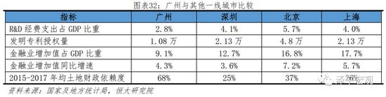 与其他一线城市相比,广州存在创新能力弱、金融业发展不足和土地财政依赖度较高的问题,第三城地位面临挑战。第一,近年广州R&D经费支出占GDP的比重一直徘徊在2-3%左右,2018年为2.8%,北京、上海、深圳已经分别达到5.7%、4.1%、4.0%;2018年发明专利授权量,广州只有1.08万件,低于北京的4.8万件、上海的2.13万件、深圳的2.13万件,和南京(1.1万件)、杭州(1.02万件)等二线城市处于同一水平。第二,金融是现代经济的核心和资源配置的枢纽,广州2018年金融业增加值占GDP的比重为9.1%,而同期北京为16.8%、上海为17.7%、深圳为12.7%;从增速看,同期北京金融业增加值同比增速为7.2%,上海为5.7%,广州仅为4.3%。第三,2015-2017年广州年均土地财政依赖度达到了68%,远高于北京的37%、上海的26%、深圳的25%。整体来看,当广州GDP在2016年被深圳超越之后,广州除了华南交通枢纽和政治中心的地位外,在深圳面前可以扬眉吐气的似乎只剩下历史积淀、科教资源和美食。在这样的形势下,“北上广深”的城市格局或面临调整,广州作为中国第三城的地位面临挑战。