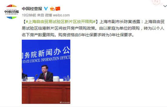 上海市副市长陈寅透露:上海自由贸易试验区临港新片区将放开房产限购政策。由以家庭为单位的限购,转为以个人名下房产数量限购。购房资格由5年社保要求转为3年社保要求。