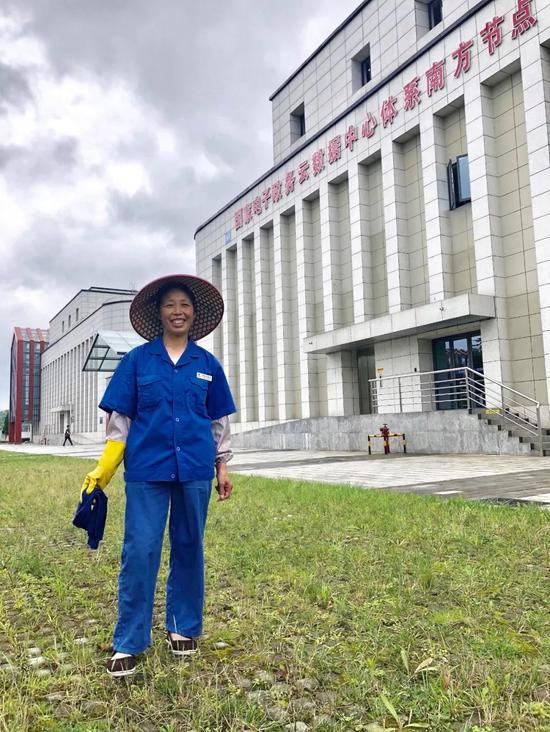 见到韩阿姨时我们正在航拍电信的园区,无人机飞到近百米的空中,叙事的视角也变得宏大。不远处的机房外面,她一手握着抹布,一手拿着打开免提的手机接听电话。
