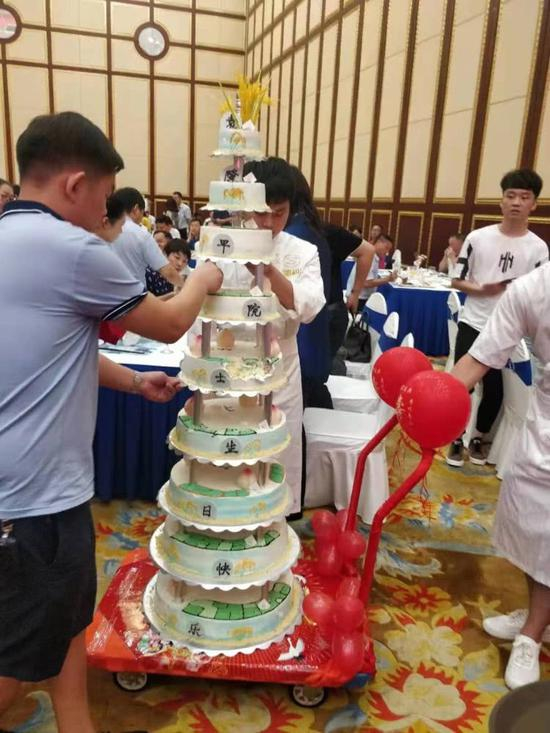 紧跟着三个可爱的孙女为袁院士送上生日蛋糕。生日蛋糕共九层,“袁隆平院士生日快乐”的九字祝福被分放在每一层。蛋糕整体造型以田园风光为主,上面点缀以寿桃,最顶上是一把金黄的稻穗。