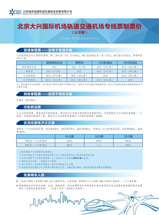 新京报快讯(记者 李玉坤)市发改委今天组织发布会,大兴机场线投资运营方城市铁建公司相关负责人会上介绍了地铁大兴机场线票价方案,公示时间从即日起到9月14日。