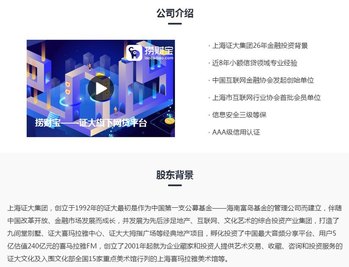 而捞财宝在其官网上则这样介绍公司的相关情况:上海证大集团具有26年金融投资背景,有近8年小额信贷领域专业经验;公司同时是中国互联网金融协会发起创始单位和上海市互联网行业协会首批会员单位……