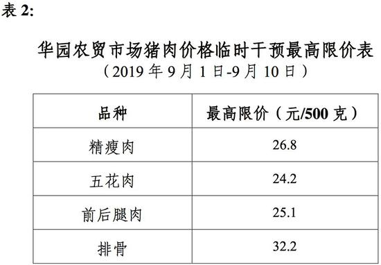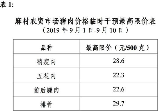 通知书显示附上了9月1日~9月10日期间,10大农贸市场猪肉价格临时干预最高限价表。