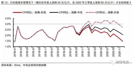 虽然猪价有快速上涨的空间,但基数效应还是会压制CPI同比的向上动力,年内CPI破3的概率很小。首先,8月份CPI同比大概率仍然维持在2.8%上下水平,破3概率很小;其次,以猪肉价格为主要变量,悲观价格为2019年底猪价上涨到36.5元/公斤、2020年三季度上涨到45元/公斤,中性假设为2019年底猪价上涨到37.5元/公斤、2020年三季度上涨到50元/公斤,悲观价格为2019年底猪价上涨到40元/公斤、2020年三季度上涨到60元/公斤,在悲观、中性和乐观三种假设下最终得到CPI的预测值,只在极度乐观情况下(猪价在年底上涨到40元/公斤,在2020年三季度上涨到60元/公斤)才会持续破3。