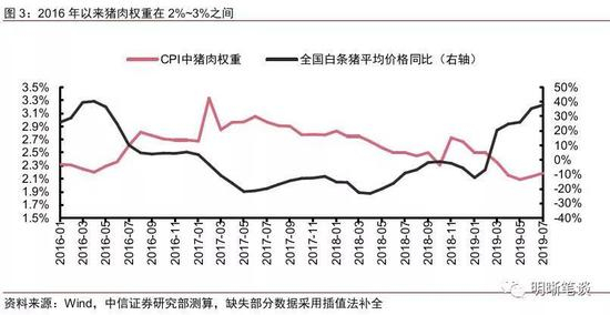 采用同比数据,利用猪肉在CPI中的历史权重来推测其未来权重。每月国家统计局在公布数据时会对物价主要影响因素做说明,其中一般会公布猪肉价格上涨幅度及其对CPI的拉动作用,由此我们可以据此倒推测算出历史上每月猪肉在CPI中的权重大小(猪价对CPI的拉动=猪肉权重×猪肉价格涨跌幅)。2016年以来猪肉权重在2%~3%之间,鉴于统计局对商品权重的微调机制,我们认为猪肉的权重大概在2.5%左右,当猪肉价格上涨过快时权重可能下调,反之亦然。
