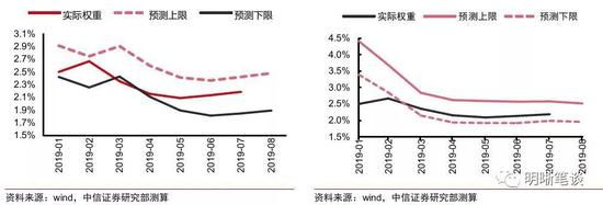 估计未来猪肉权重,我们用历史权重一个标准差范围作为未来一个月权重来进行测算。计算猪肉权重历史数据的标准差,然后再用最近一个月的CPI加减一个标准差,作为下个月权重的预测区间。为了检验该方法的有效性,我们还进行了回测和模拟测试,即通过历史数据预测2019年各月猪肉在CPI中的权重,并与通过统计局公布的数据计算而得的实际权重作对比(以下均称“实际权重”),结果显示除三月份CPI小幅偏离预测区间外,其余各月的CPI均在预测区间范围之内。由该方法我们预计今年八月份猪肉在CPI中的权重大概处于 [1.89%,2.48%]范围之内。