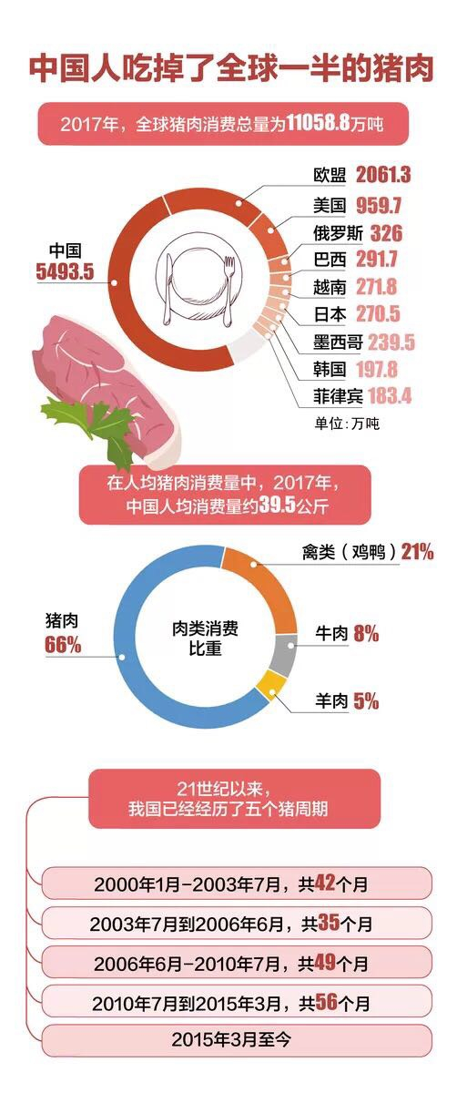 在农业社会,猪不仅是平民家庭中最重要的肉食来源,也是重要的经济来源。甚至到21世纪,猪肉仍是国人肉食蛋白摄入的主要来源。农业农村部发布的数据显示,2018年,全国猪、牛、羊、禽肉产量为8517万吨,其中猪肉产量5405万吨,牛肉644万吨,羊肉475万吨,禽肉1994万吨。