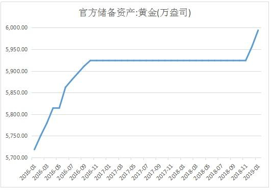 从2018年12月起,央行的黄金储备从5924万盎司连续9个月增加321万盎司至6245万盎司。