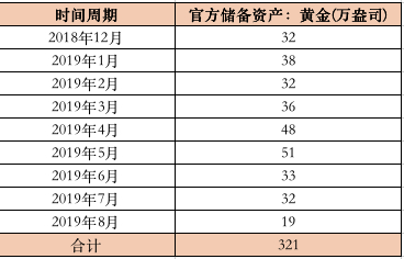 从去年12月开始央行开启黄金“买买买”模式,连续9个月增持321万盎司:2018年12月首次增持32万盎司;2019年1月到7月连续增持,从30万盎司到50万盎司不等;刚刚结束的8月增持19万盎司。