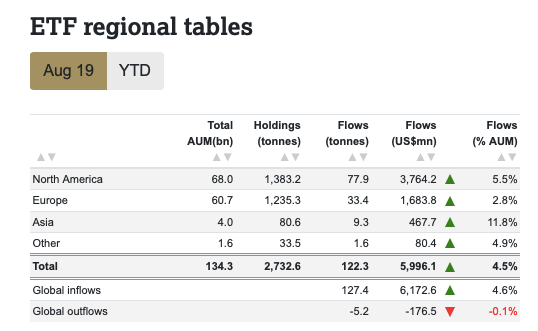 而黄金价格8月继续上涨约7%,使得全球黄金ETF的资产管理规模增长至1340亿美元。