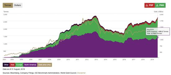 世界黄金协会最新发布的数据显示,8月份全球黄金ETF总持仓规模按月上升5%至2733吨,与2012年底的历史最高只相差2%,而当时的金价比现在的水平高出约9%。